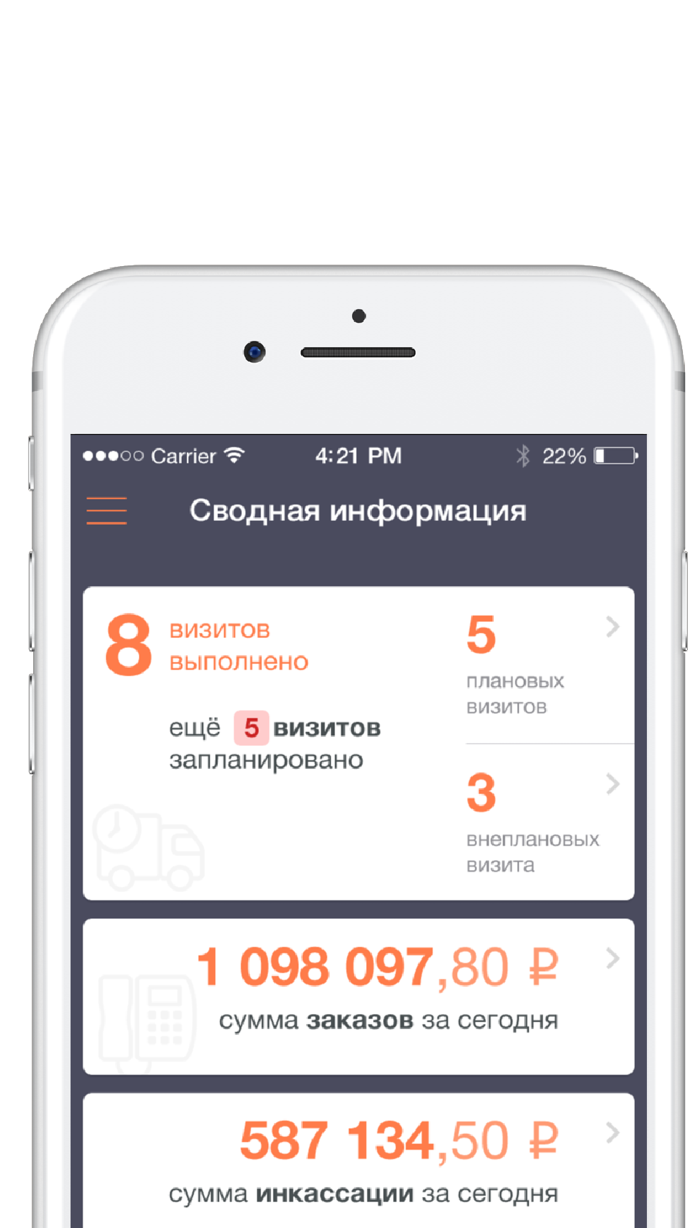 Контроль посещения торговых точек, сокращение времени на отправку заказов.